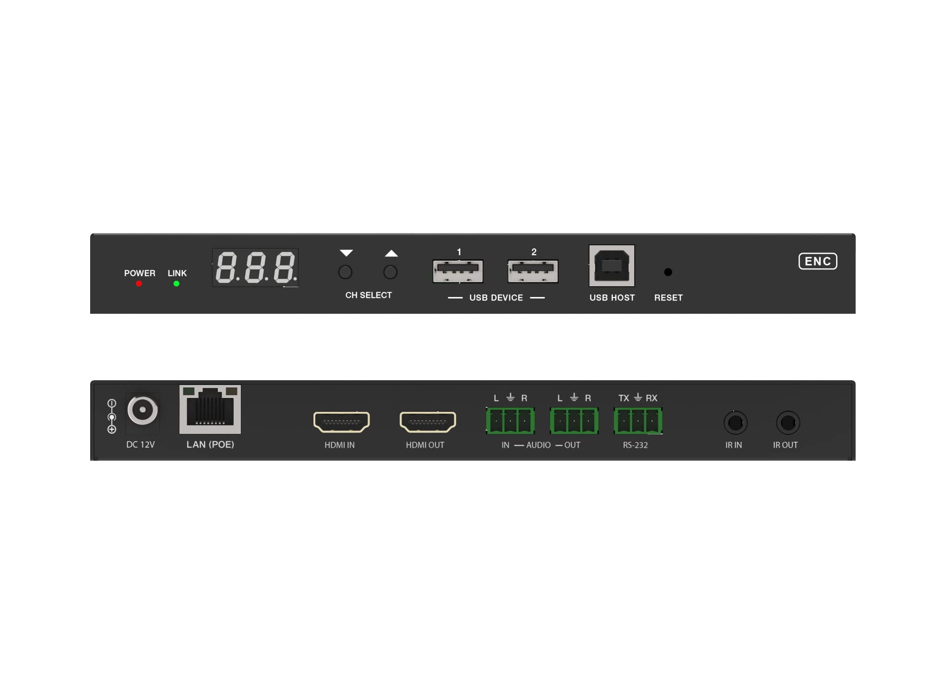 Encoder supports HDMI local loop output. The product supports analog audio embedding and extracting. It also supports USB/KVM function and bidirectional IR/RS-232 control (pass-through & Guest mode).